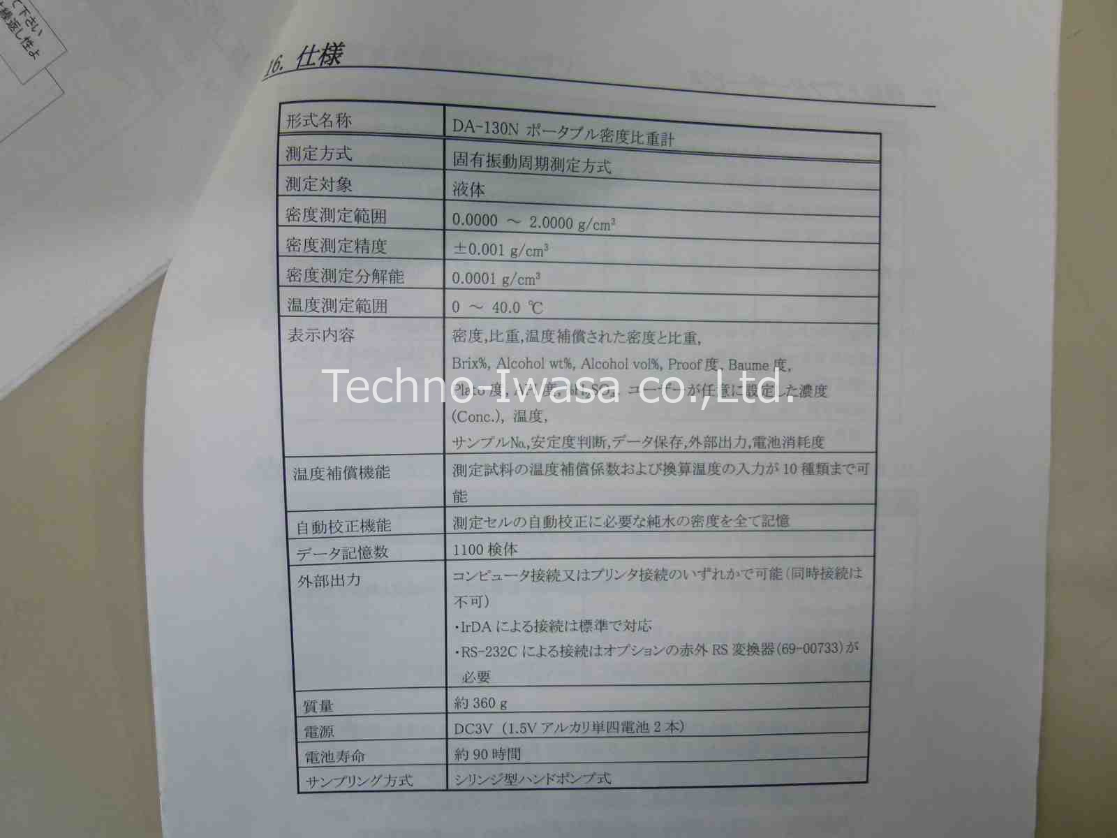 | 仕 様 | 測定範囲:密度として0.0000〜20000g/cm3 分解能:0.0001g/cm3 測定温度範囲:0〜40℃ ヒヨウジ 表示内容:密度.比重.温度補償比重.温度補償密度.Brix% :Alcoholwt%.Alcohol vol%.%H2SO4.API度. :Baume度.Plato度.Proof度及び温度(℃).測定日時 :試料NO.安定度判断.等々 温度補償機能:度補償すべき換算用温度と試料毎の係数を :10種類入力可能 電源:単4x2アルガリ電池 外寸ケ65x115x235h.重量:360g | | |